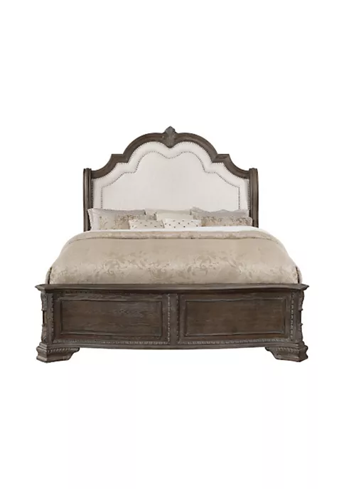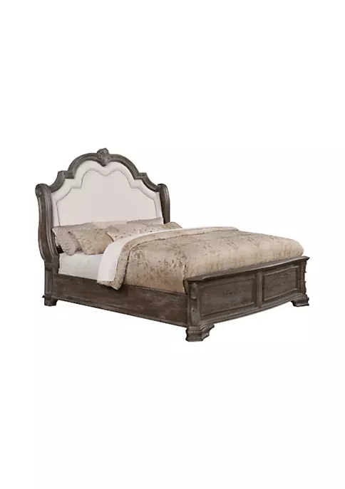 Unique features of this piece’s ornate headboard include a studded pattern, linen like upholstery, and dramatic scroll designs. The footboard continues the classy appearance with a highly detailed design from top to bottom. Finally, a wire brush antique finish bestows a heritage inspired touch. Complete your Alexandria Antique Bedroom with the matching dresser, mirror, chest, and nightstand.