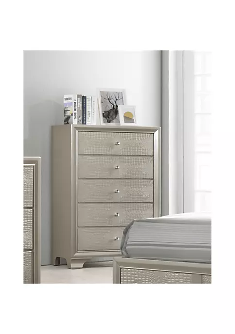 Deliver plenty of visual intrigue as well as functionality to your kid’s bedroom with the charming quality and storage capacity of our Glitz and Glam Chest. The alluring look of this piece brings charm and grace to any setting. And its elegant champagne tone is the perfect finishing touch!