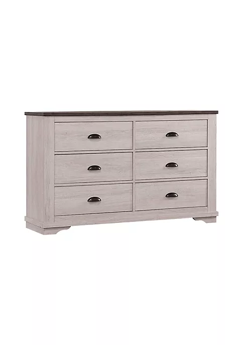 - Six spacious drawers | French dovetail drawer construction | Metal cup pulls | Plenty of surface space | Bracket feet | Modern farmhouse style