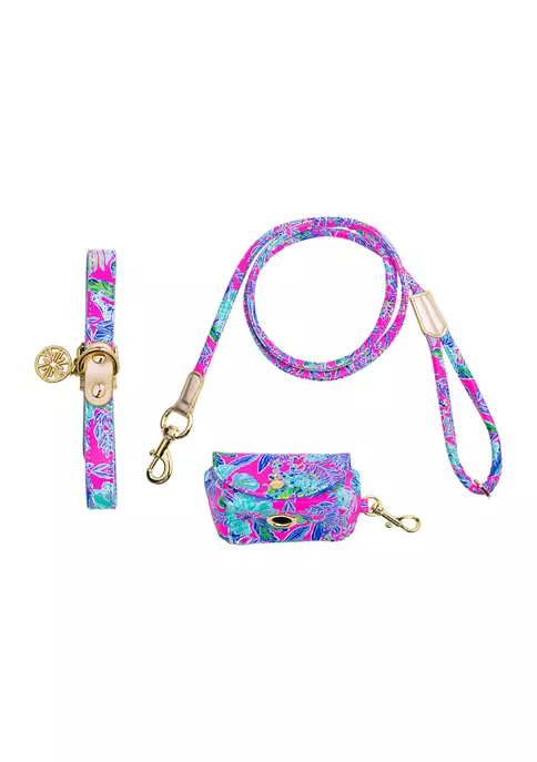 Take your pup for a walk in style with this dog walk set from Lilly Pulitzer®. The printed leatherette collar attaches to a matching leash, which also features a matching waste bag pouch. Gold hardware, including a lobster claw clasp, accentuates the bright print with some shine. Enjoy some extra fun by matching your outfit with these pet accessories.